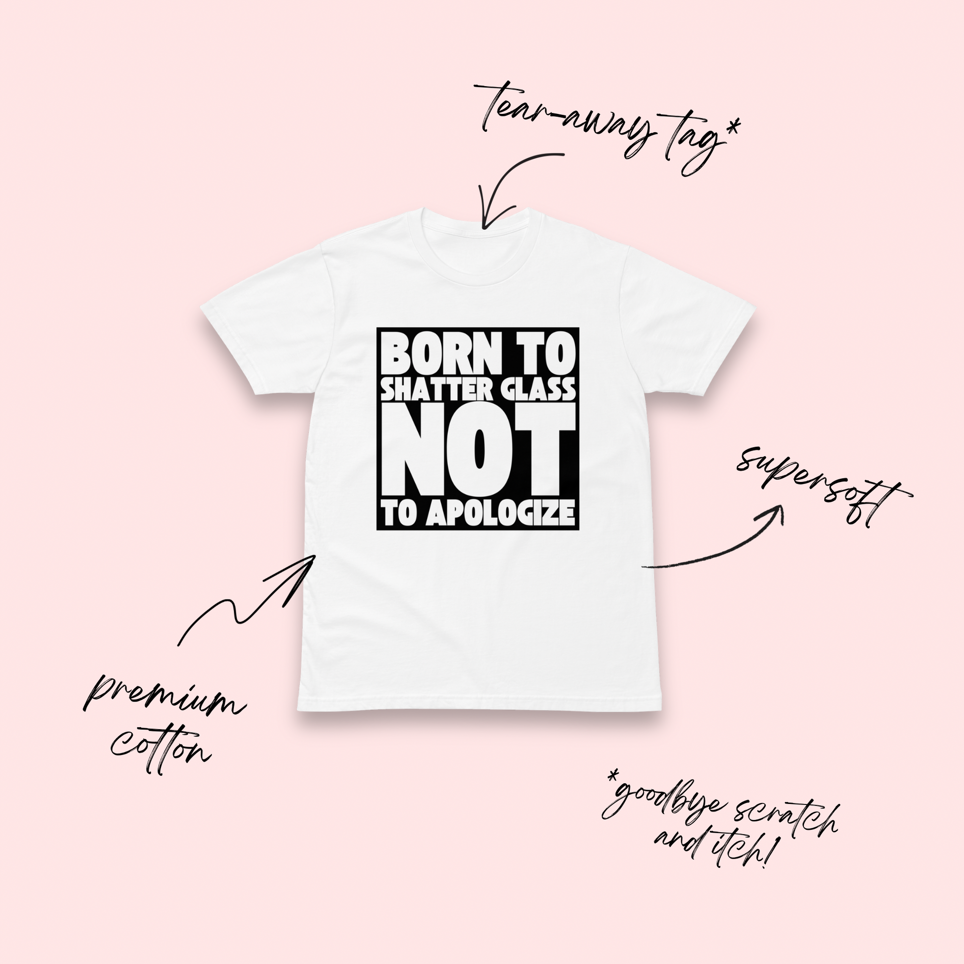 • Bold front print featuring the phrase BORN TO SHATTER GLASS NOT TO APOLOGIZE in white font on black background