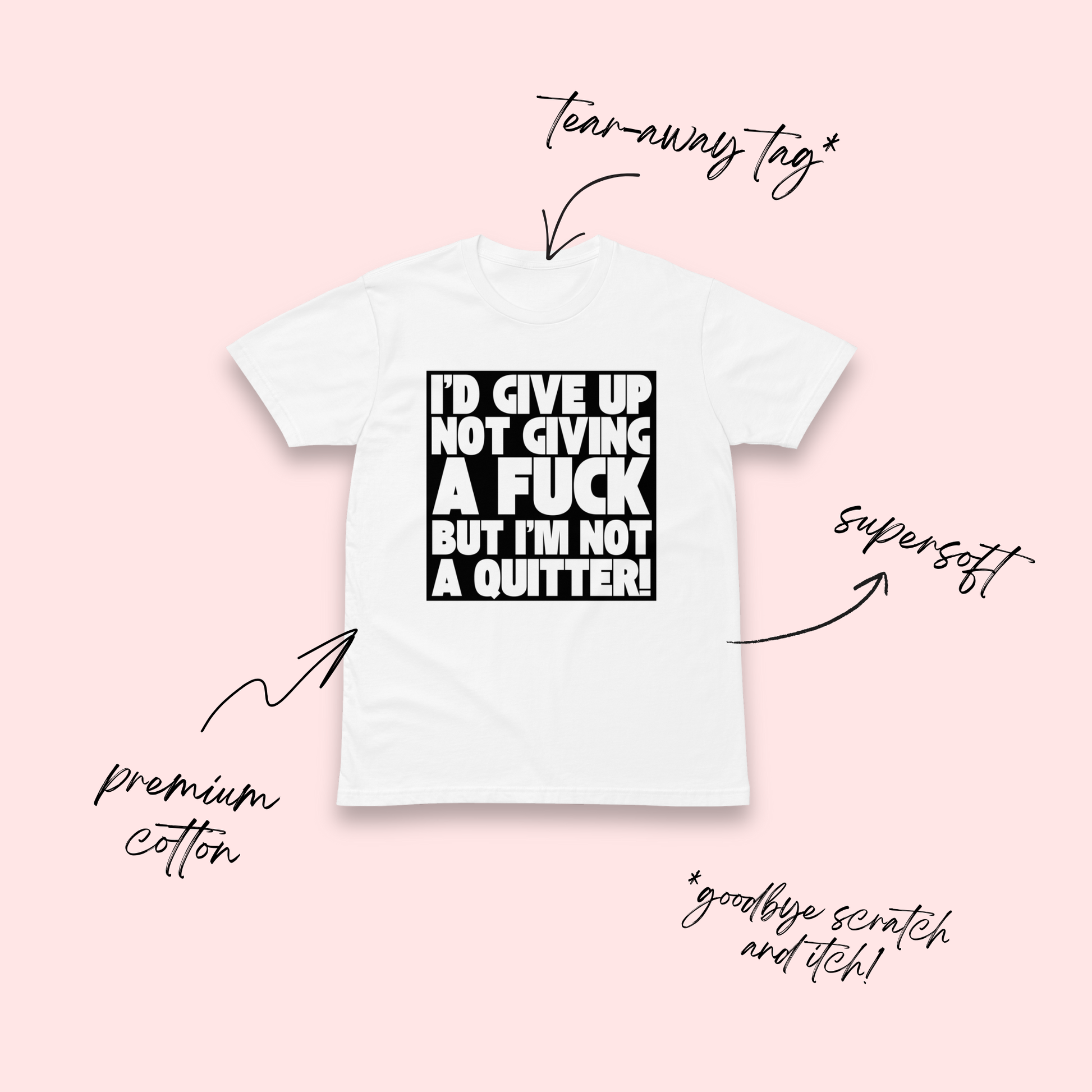 • Bold front print featuring the phrase I'D GIVE UP NOT GIVING A FUCK BUT I'M NOT A QUITTER in white font on black background