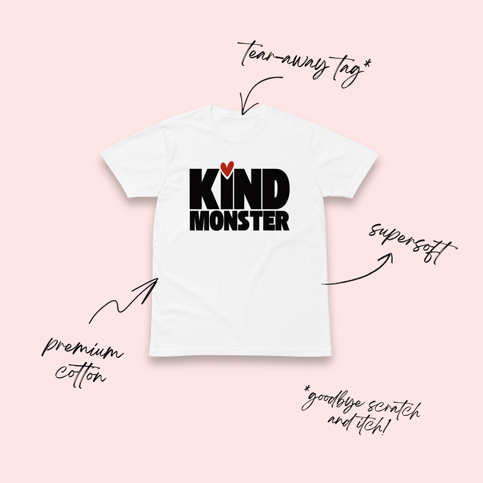 • Bold front print featuring the phrase KIND MONSTER in black (and a small red heart