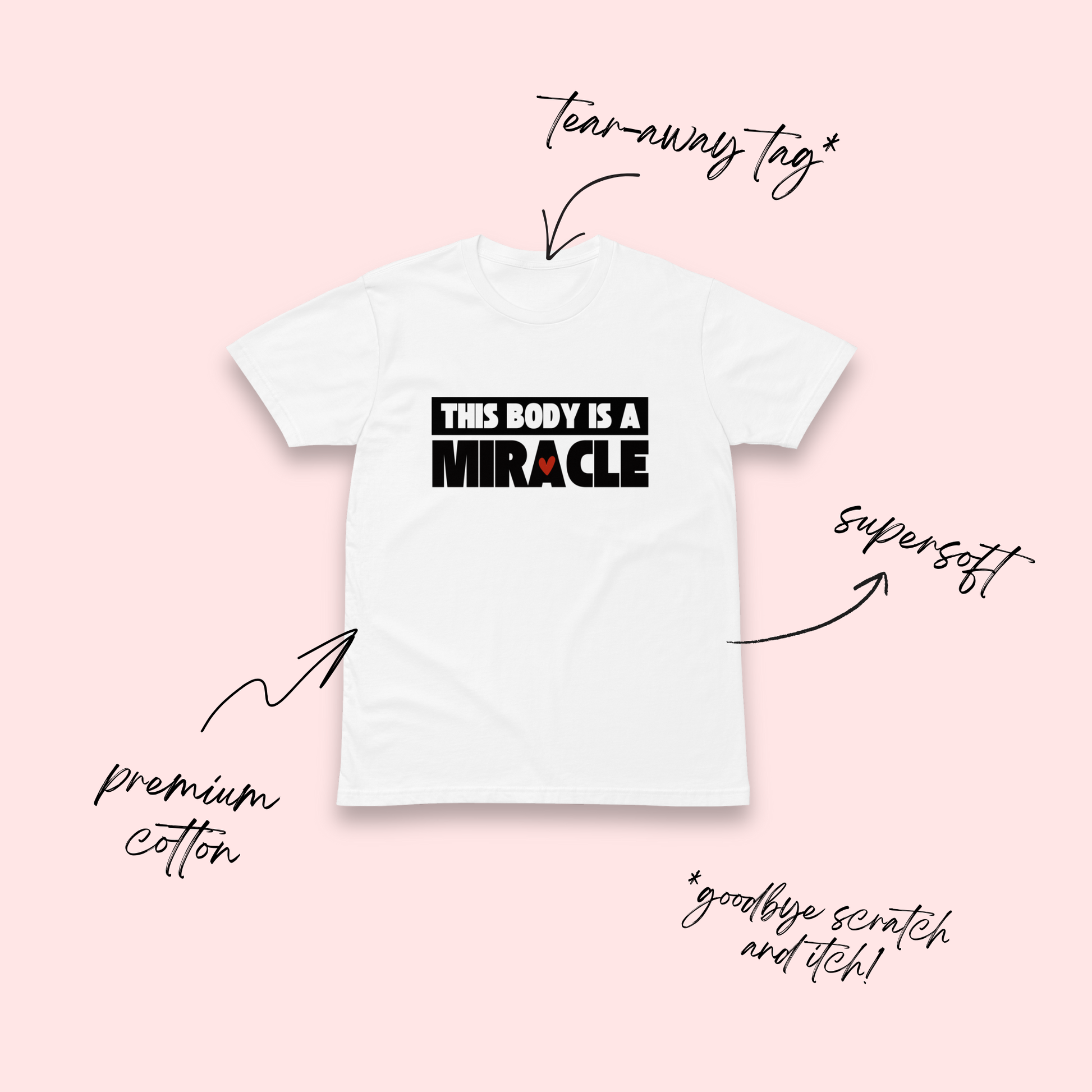 • Bold front print featuring the phrase THIS BODY IS A MIRACLE in black and white (with a tiny red heart)