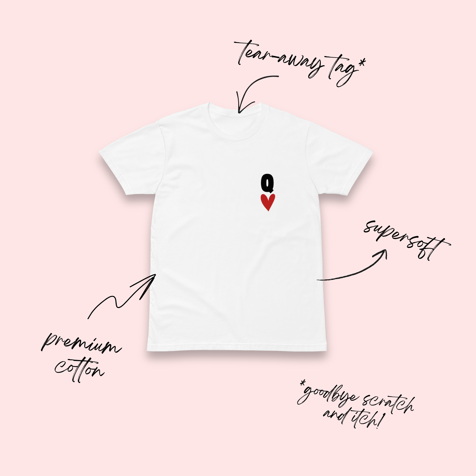 • Bold pocket print featuring the letter Q and a little red heart