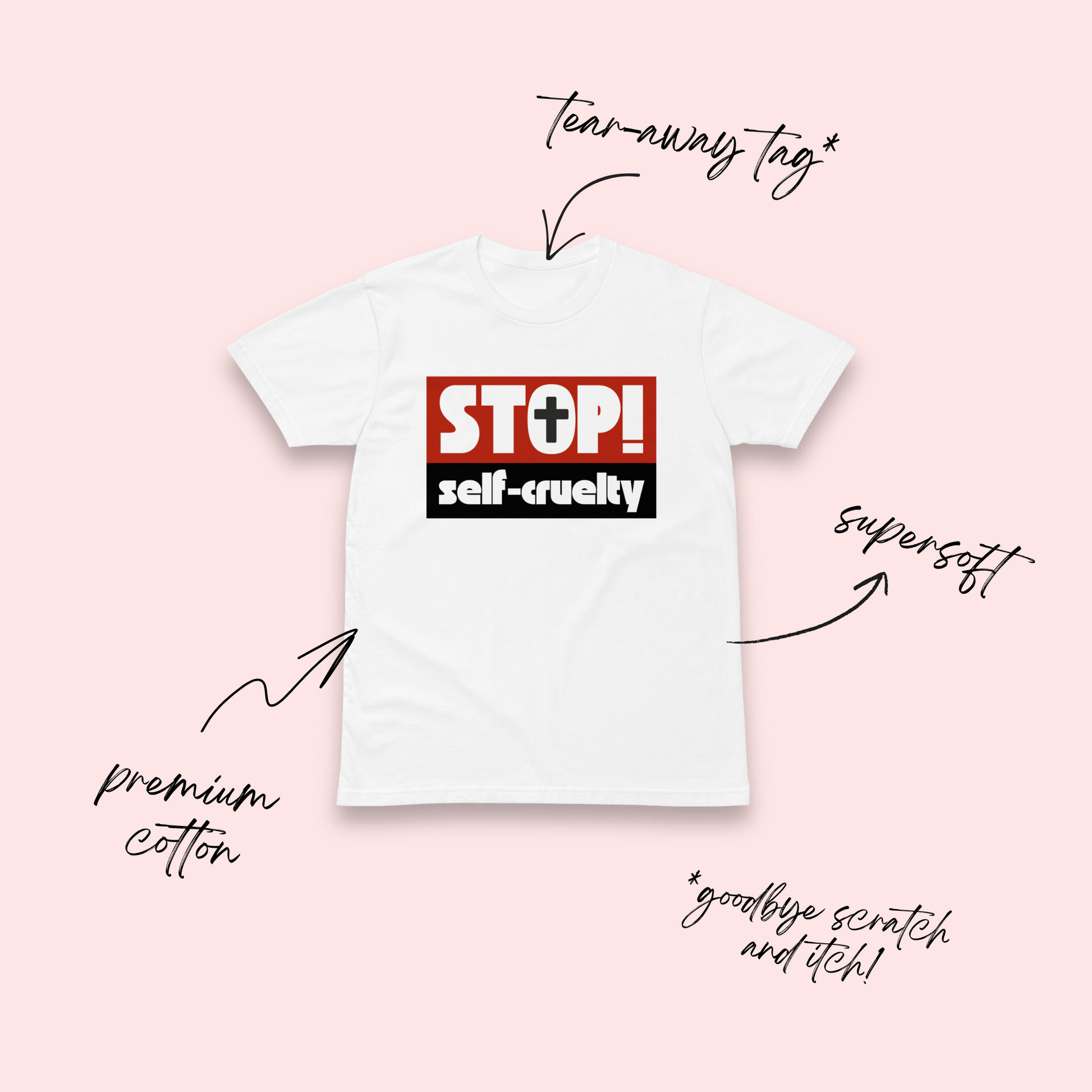 • Bold front print featuring the phrase STOP! self-cruelty in white font on red and black background