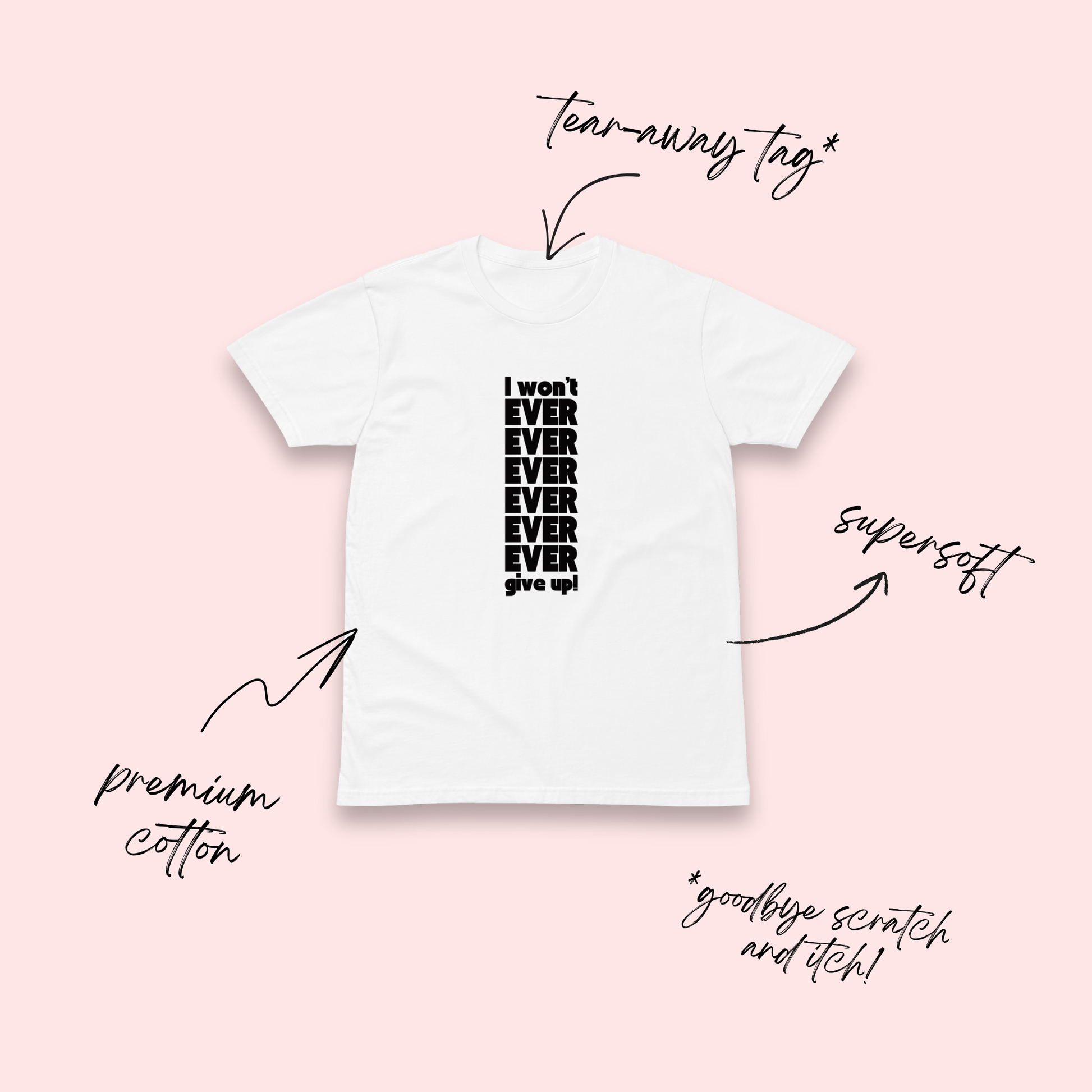 • Bold front print featuring the phrase I won't EVER give up! in black